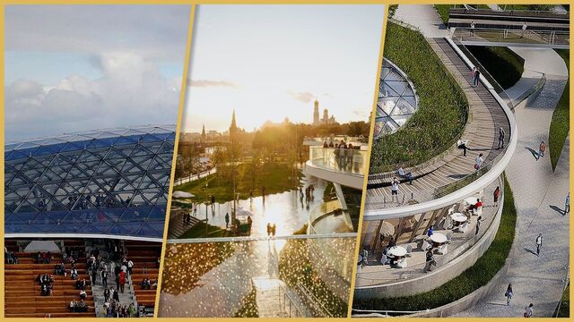 • главные архитектурные объекты Зарядья - сочетание футуристических форм и продуманного городского пространства